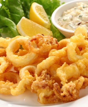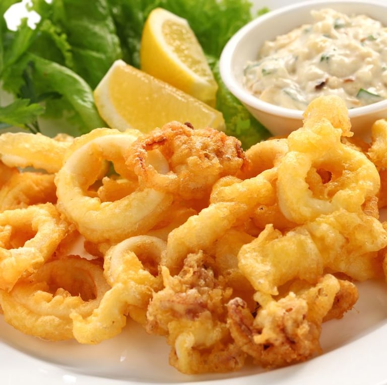 Crispy deep-fried calamari served with garlic mayo and lemon — perfect as a starter or shared appetiser.